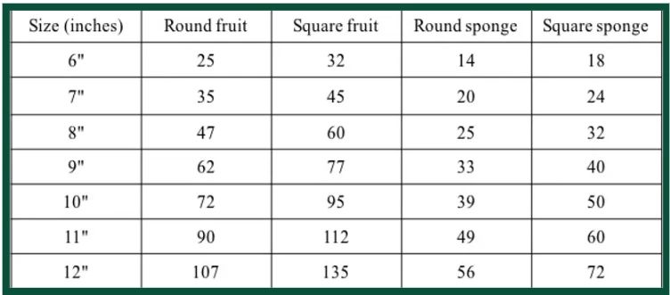 Guide to the number of portions you can cut from standard height round and square cakes of various sizes.